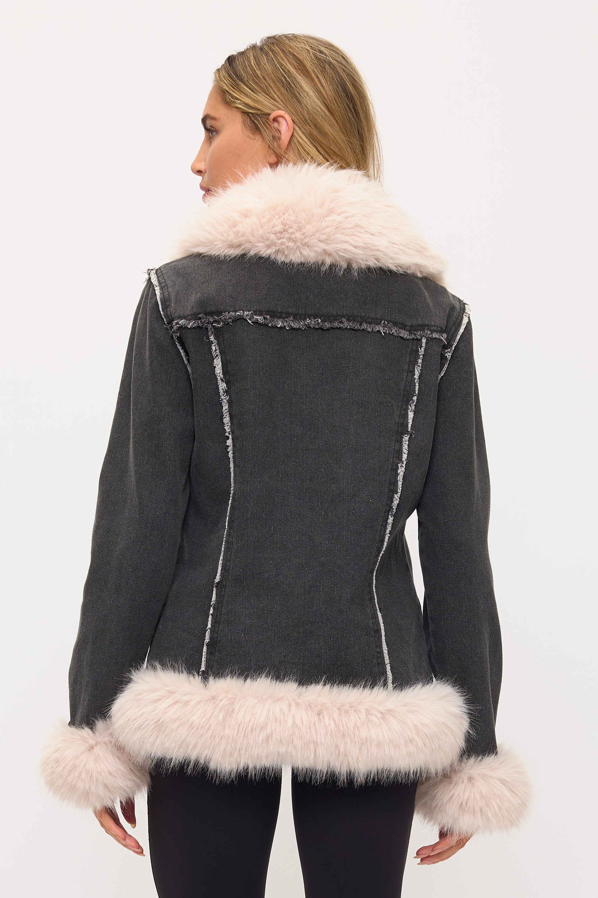The relaxed denim silhouette offers comfortable wear while coordinating fur cuff details add sophisticated finishing touches. Premium washed denim construction ensures durability and timeless style, perfectly balanced by plush synthetic fur accents.