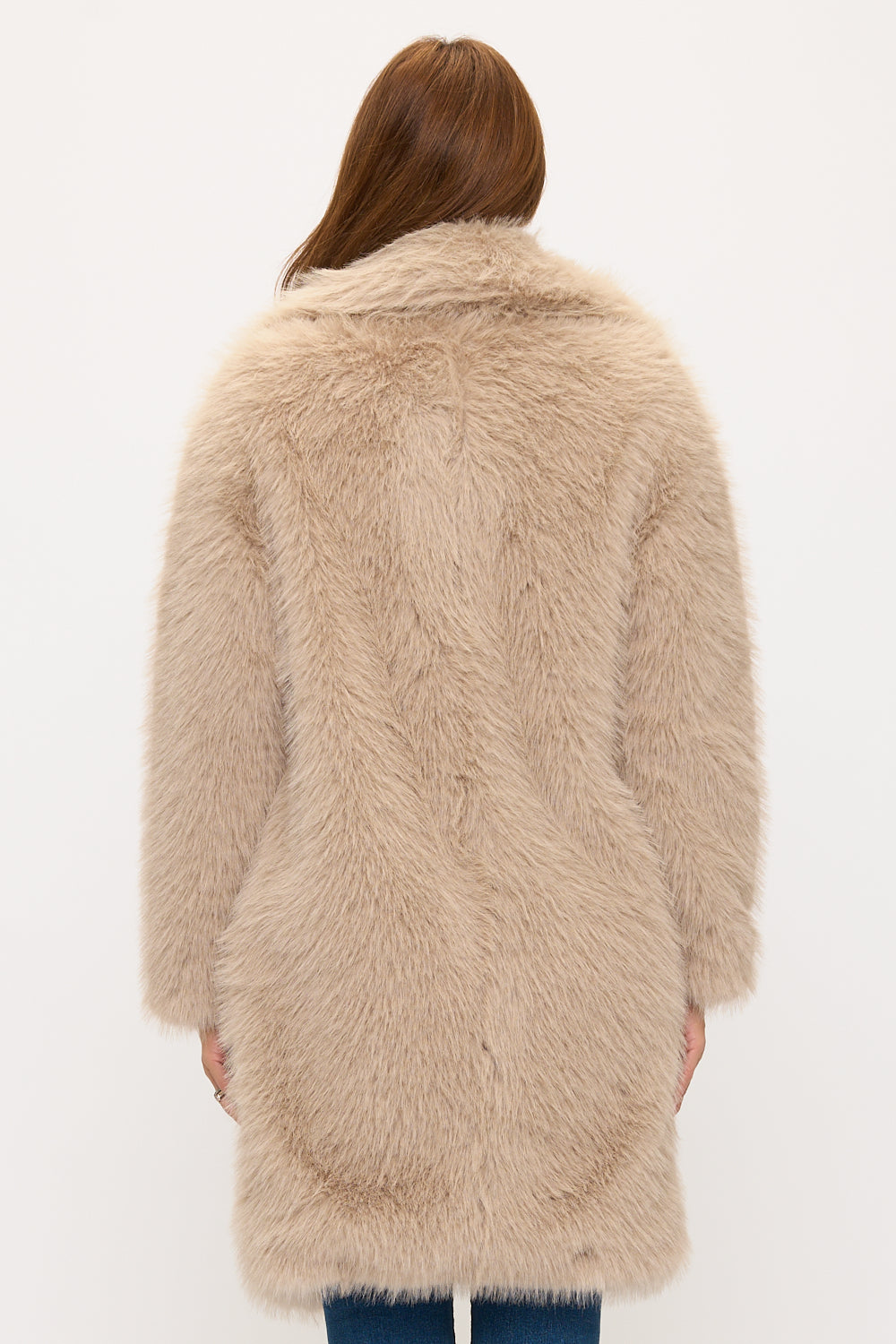 The relaxed fit offers effortless sophistication with generous proportions that envelop the body beautifully. The dramatic oversized collar frames the face with plush texture, while the open-front design allows for versatile layering and styling options.