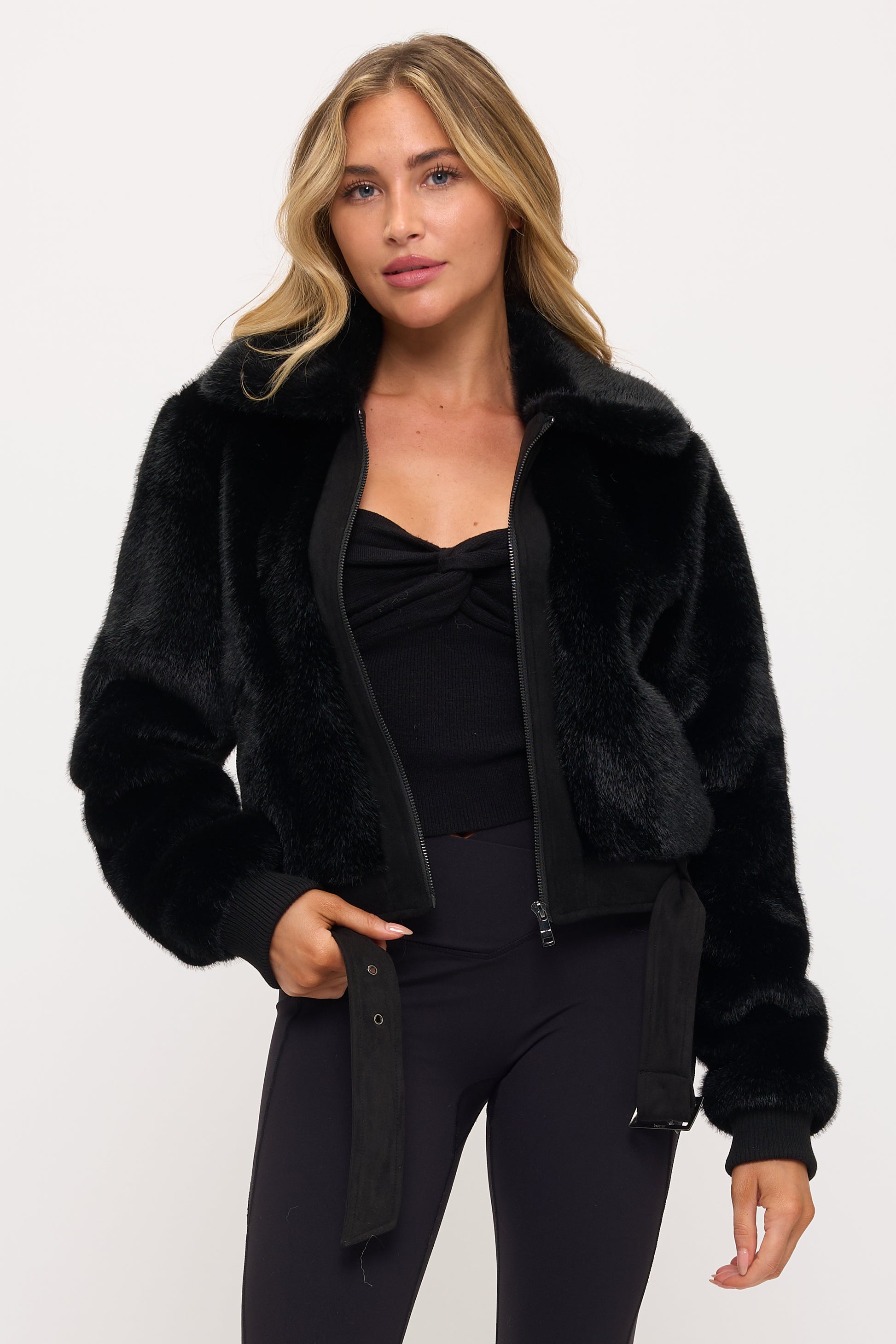This edgy cropped jacket fuses voluminous faux fur with tailored suede panels and statement belt hardware for contemporary luxury appeal. The structured zip-front design creates athletic sophistication while oversized proportions deliver comfort and dramatic visual impact.