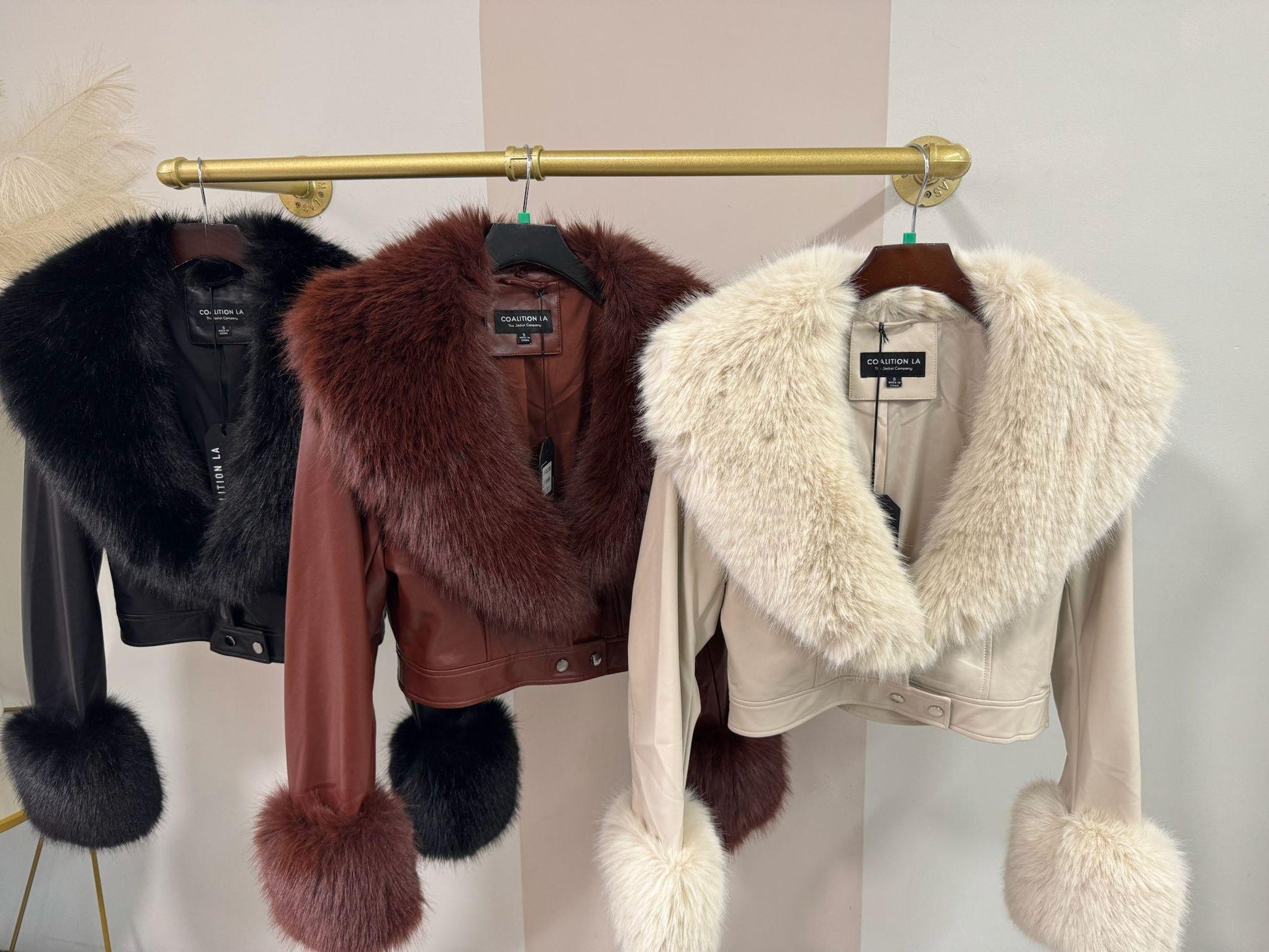 Embrace sophisticated glamour with this luxurious faux leather and fur jacket that redefines elegant outerwear. The sleek faux leather construction features a dramatic oversized fur collar that creates instant luxury and warmth. Matching fur-trimmed cuffs complete the coordinated look while adding cozy comfort. This cropped silhouette includes a flattering wrap-style belt that cinches the waist for a feminine hourglass shape. The premium materials create beautiful texture contrast that elevates any ensemble from casual to couture. Perfect for the modern woman who appreciates refined details and statement-making pieces. This versatile jacket transitions seamlessly from office meetings to evening events, adding instant sophistication to dresses, pants, or skirts. The plush fur accents provide both visual impact and practical warmth during cooler months. Available in classic black for timeless elegance, cream for soft sophistication, and rich brown for warm luxury.Â
