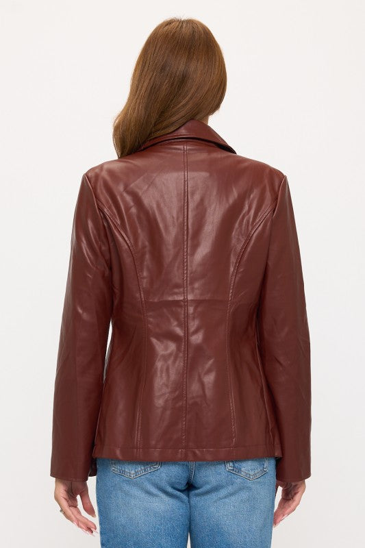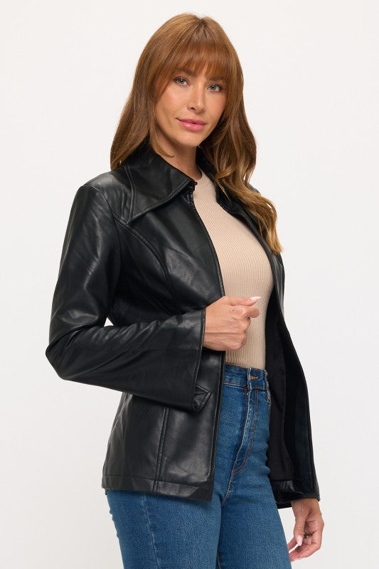 Embrace sophisticated artistry with The Bohemian Baroness, a luxuriously crafted faux leather jacket that captures free-spirited elegance with aristocratic flair. This distinctive piece features a unique zip-front design with an oversized pointed collar that creates dramatic visual impact and vintage-inspired charm. The premium faux leather construction delivers rich texture and supple feel while maintaining ethical consciousness. The fitted silhouette through the body creates a flattering shape that celebrates feminine curves while the longer length provides elegant coverage.