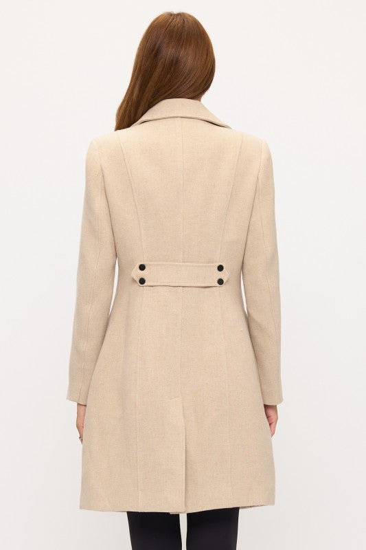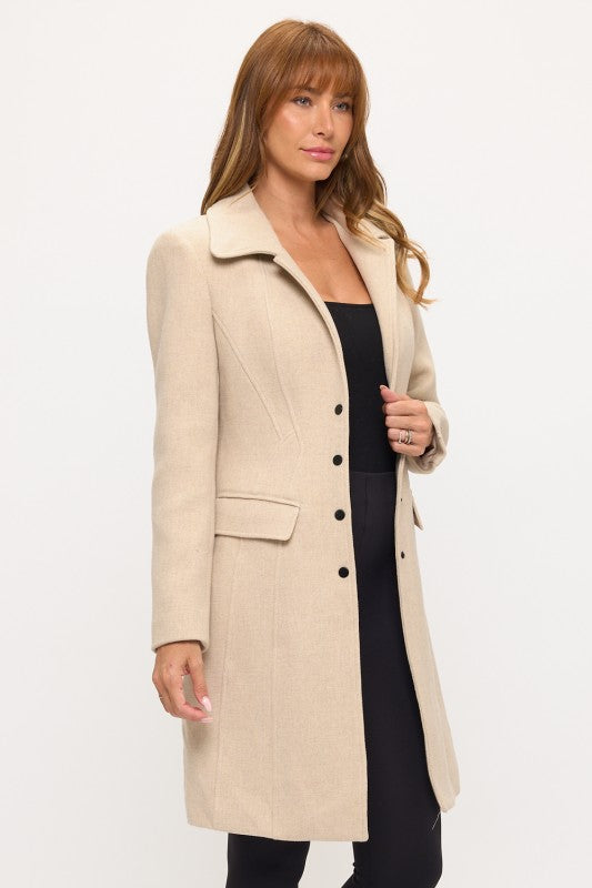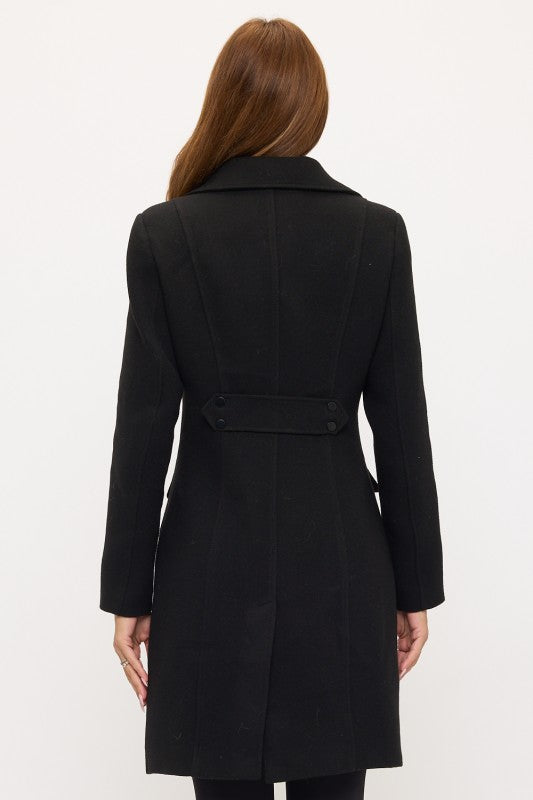 The sharp collar and precise lapels frame the face with confidence while the expertly tailored waist creates a powerful hourglass shape that projects strength and sophistication. The extended length provides stately coverage while maintaining sleek lines perfect for high-level professional environments. Clean button detailing and minimalist design enhance the coat's authoritative presence without compromising refined appeal.