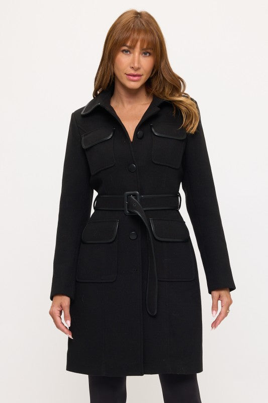 The structured silhouette showcases a classic button-front closure, sharp lapels, and multiple functional pockets that combine utility with commanding style. The longer length enhances its authoritative presence, while the fitted waist maintains a touch of feminine refinement.