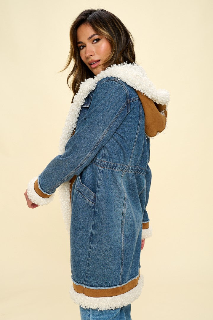 Embrace aristocratic adventure with The Wandering Duchess, a breathtakingly designed coat that harmoniously blends washed blue denim, refined suede, and luxurious curly faux fur into one noble masterpiece. This exceptional garment features expertly constructed denim base elegantly enhanced with suede panels and lavishly adorned with plush curly faux fur that creates spectacular textural grandeur.